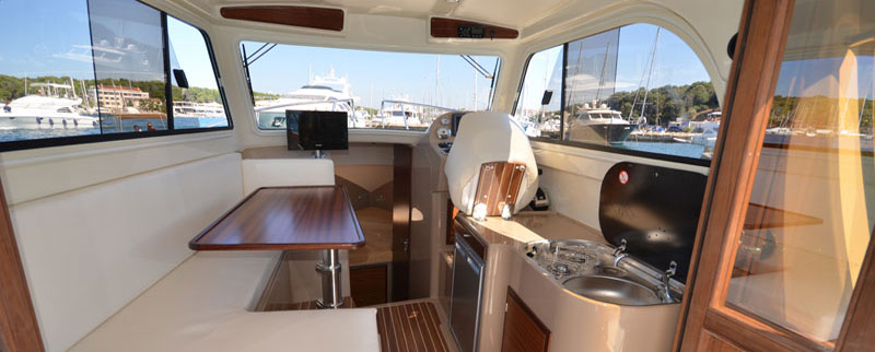 The control console is very simple and clutter free, it contains all the necessary engine instruments, compass, windlass button and siren, control panel, heating, CD radio device, an outlet to 12 V, two panels with fuses and a five shank wheel with a Garmin GPS plotter. Along the right side there is a command throttle for the motor, remote control spotlights and underneath them are the main electrical switches and an open storage. Sitting in his position, the helmsman can rest his feet on an intended inox tube while the view still remains excellent.